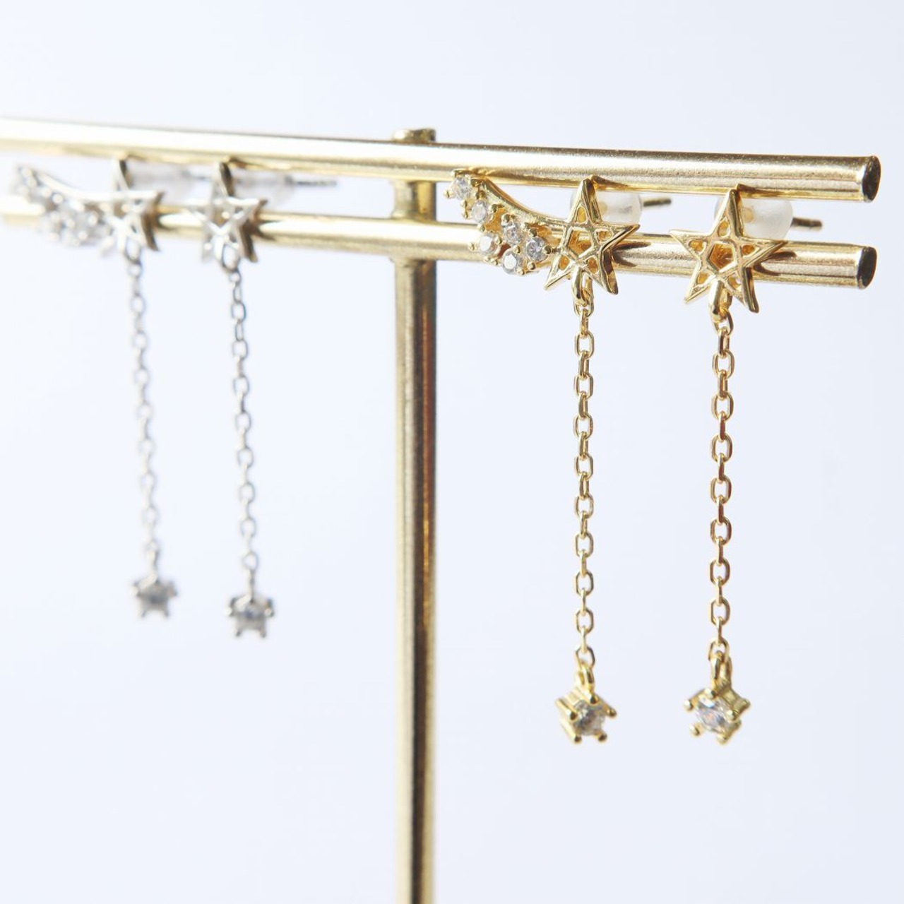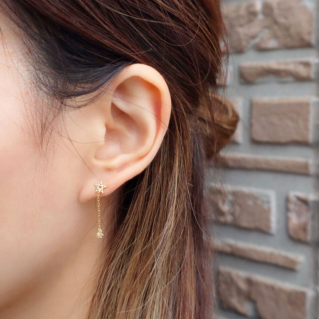 左右違うデザインがお洒落な星モチーフのチェーンピアス。