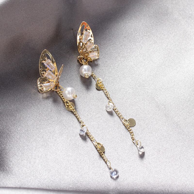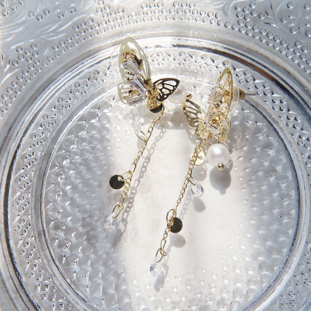 蝶 バタフライ ピアス ロング ビジュー パール ジルコニア 立体 透かし 揺れる チェーン ゴールド レディース S925 金属アレルギー対応