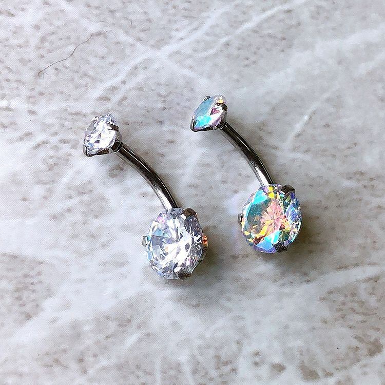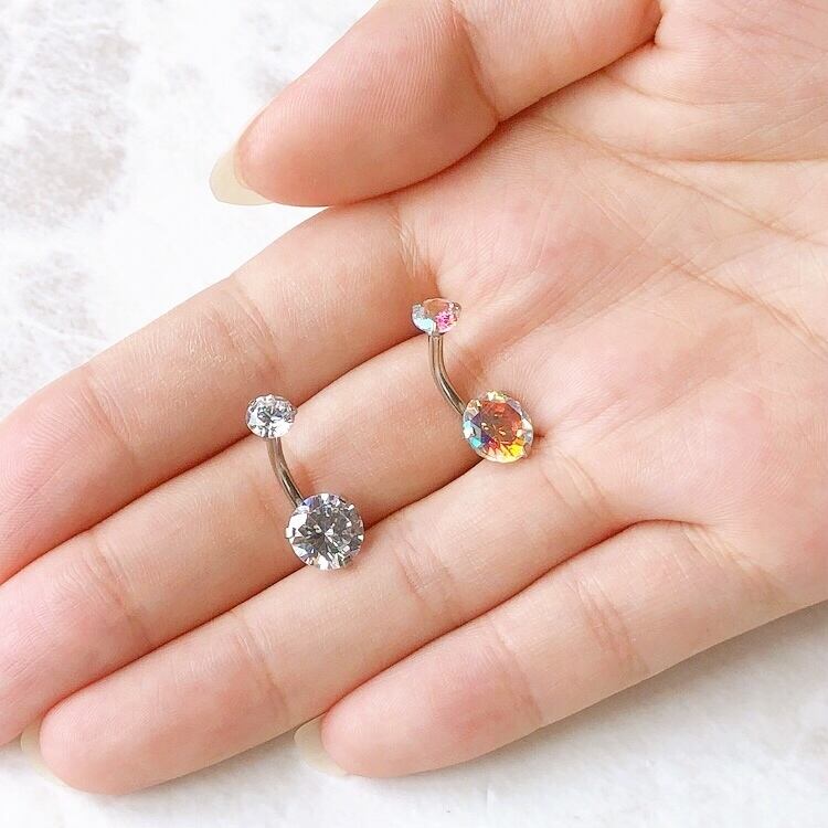 ボディピアス へそピアス 臍ピアス バナナバーベル ネイブル イヤーロブ 316Lサージカルステンレス インターナル ダブルジュエル ジルコニア ストーン 立爪 レインボー オーロラ シンプル 定番 14G 1個
