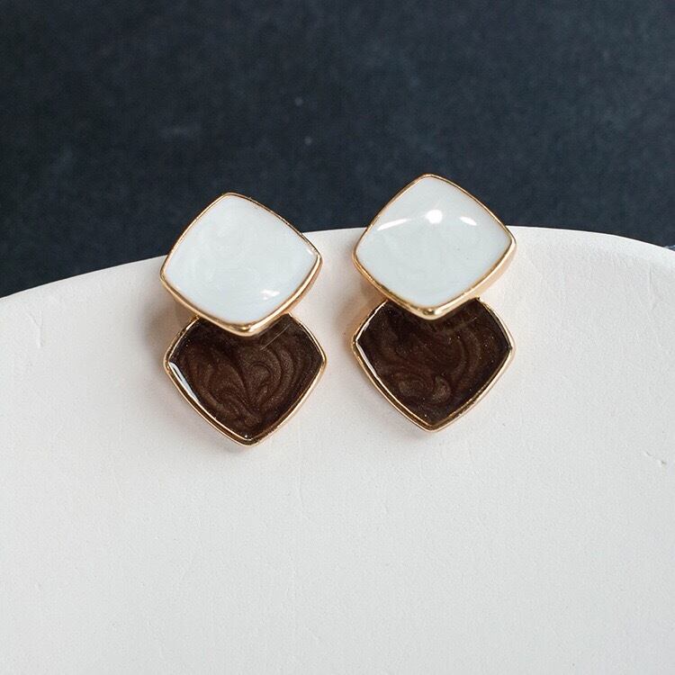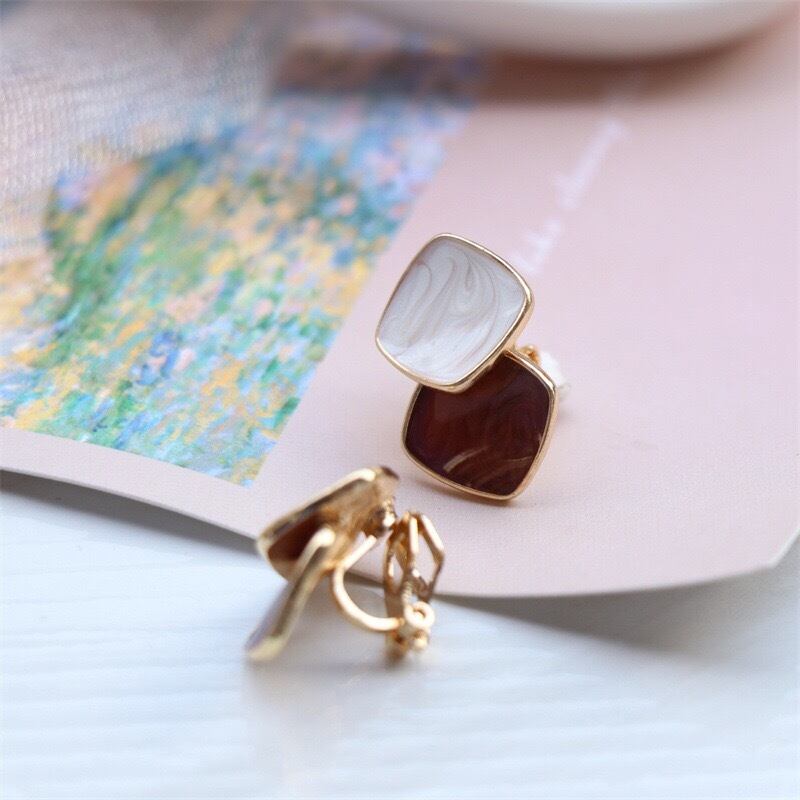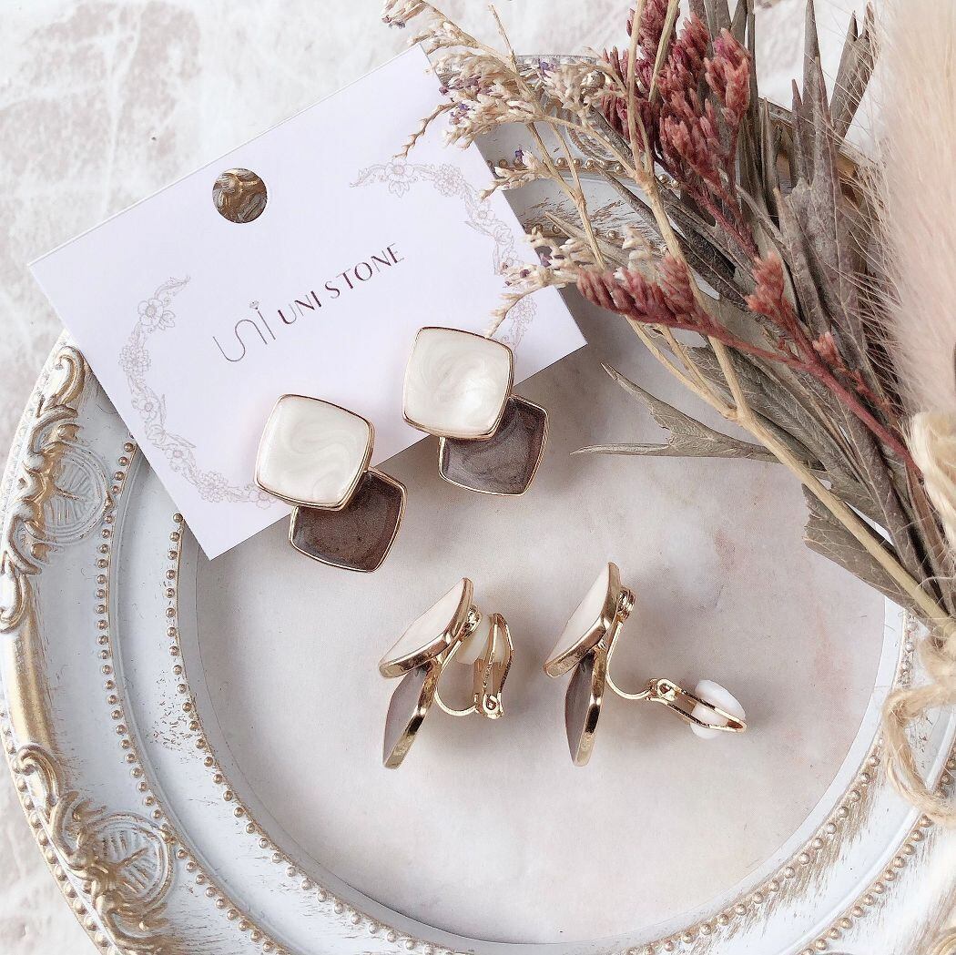 イヤリング ダイヤ形 ひし形 2連 シンプル ブラウン シリコンパッド付き クリップ式 両耳
